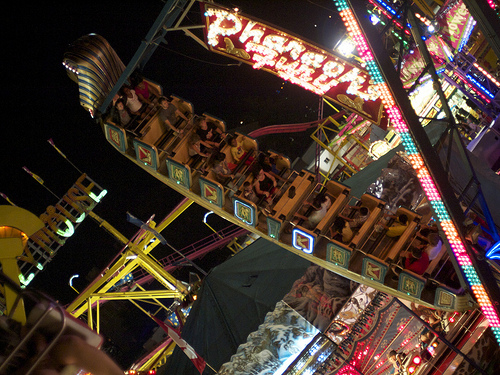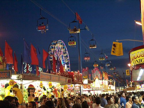 So midway has made its way. Its real source is now academic; for millions midway has an immediate humidity and wildness, an air of deep-fried everything and a smell of onions and fat, and sticky fingers, and the pops and bangs of games and the urgings of young men and women with megaphones to get you to spend your money on their entertainments, and the attractions of rides that make you fly and fall and scream and splash and laugh and whirl. It is the via media, admitting all – for a price – and everything is up for grabs, and while we are amid it it is all our world whirling around us: a madness we have made for our own diversion, until at day’s end leave, arms full, pockets empty, following the dispersing crowds and at last making our several ways back home.