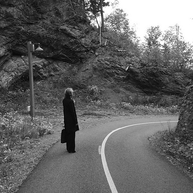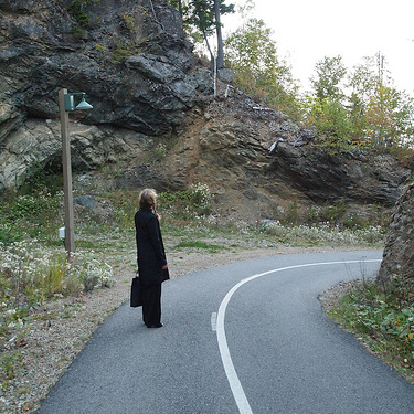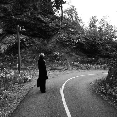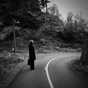 Let’s look at this effect in a photograph for a moment, shall we? Here is a photograph of my lovely wife standing on the road up to the golf course from Le Manoir Richelieu in Charlevoix.