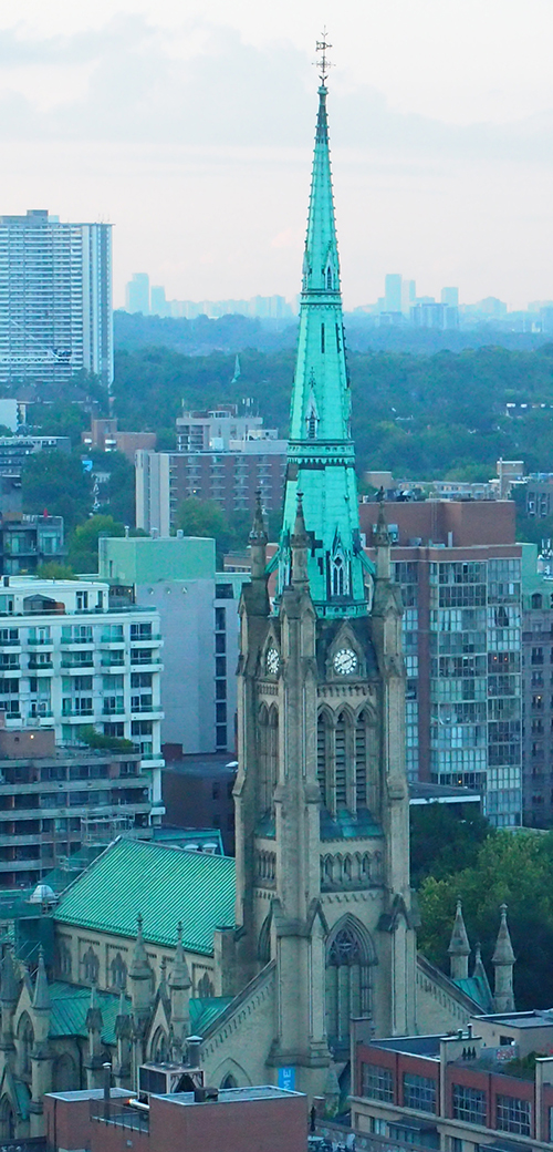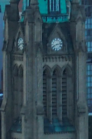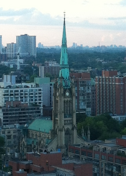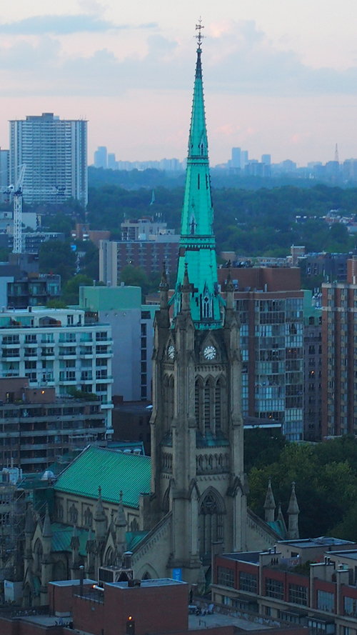 Because you’re my friend, I took a little time to take a few pictures out my window of the Cathedral Church of St. James here in Toronto, using three cameras, the third of which with three different lenses. These will help you to see why, for most people, with even the cheapest cameras giving at least 8 megapixels, the megapixel count in your camera doesn’t matter; it just leaves you mega-pixilated.