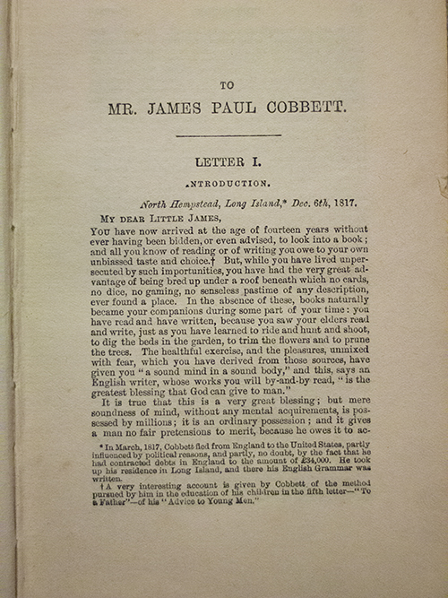 Why is he writing letters to his son? He is on Long Island, New York. What on earth for? The footnote is instructive: “In March, 1817, Cobbett fled from England to the United States, partly influenced by political reasons, and partly, no doubt, by the fact that he had contracted debts in England to the amount of £34,000.”