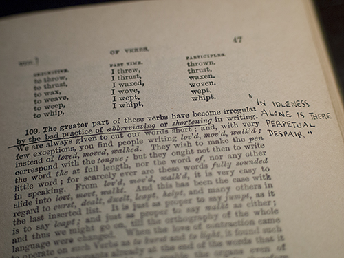 Behold Cobbett’s English Grammar, a volume far more sure in its learning than even those far more knowledgeable books piled beneath it. Ah, grammar: one of those fields, like painting and sartorial fashion, in which many people feel that the confidence of their opinion is the surest index of their rightness, and they just make things up on the basis of their own felt discernment – and publish them (caveat emptor). Grammar is like feces unto the flies of prescription: people who believe that we must have rules are naturally drawn to it and impose rules willy-nilly, brooking no question or opposition, giving no quarter.
