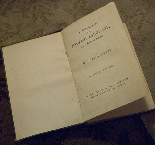 Behold Cobbett’s English Grammar, a volume far more sure in its learning than even those far more knowledgeable books piled beneath it. Ah, grammar: one of those fields, like painting and sartorial fashion, in which many people feel that the confidence of their opinion is the surest index of their rightness, and they just make things up on the basis of their own felt discernment – and publish them (caveat emptor). Grammar is like feces unto the flies of prescription: people who believe that we must have rules are naturally drawn to it and impose rules willy-nilly, brooking no question or opposition, giving no quarter.
