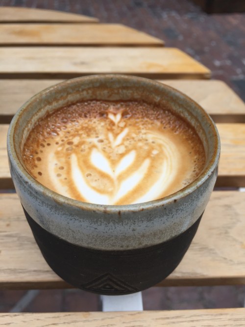 The flat whites here are small and fairly tight and served in cups without handles, so mind your fingers. The drip coffee comes in mugs with handles. It’s all very pretty. The décor is Distillery District, which means repurposed redbrick Victorian industrial. And the people-watching is good. It’s summer. It’s a tourist attraction. Any time you look up from your screen you’ll see someone interesting nearby.