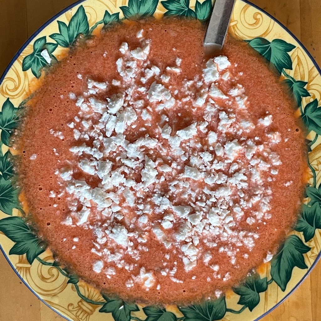 For supper tonight, Aina made some delicious gazpacho. It’s always been her dish to make – she’s the soup queen around here – so I’m not perfectly sure of the proportions, but the ingredients that go into the blender are: