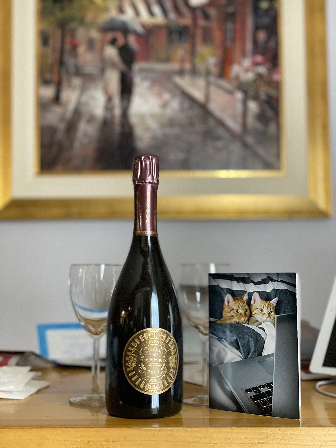 Did you notice the label on the bottle? It’s Jeeper La Grande Cuvée Millésime Brut 2005. It came well recommended, so, as Aina and I both love our fizzy-o-therapy, I bought a bottle four months ago and hung onto it for an occasion. Now, the names of Champagne houses are often a bit on the unexpected side – Krug hardly sounds French; Moët and Perrier-Jouët fool people who don’t know you’re supposed to say the t on the end of each, and Perrier-Jouët also sounds like it might be high-priced water; Taittinger is an evidently German name but an obviously French producer, so however you pronounce it is going to sound wrong to someone – but Jeeper struck me as next-level. Is it a Dutch name that ended up in France (like Citroën)? Is it some regional quirky French thing? Is it an English family that set up shop?