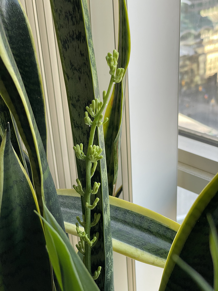 Let me go back to – not the beginning, but as far back as I know. We acquired a couple of tropical plants last year and put them in our window on a small piece of IKEA furniture that had been intended to hold a large TV, but we didn’t get a large TV, we got two plants. One of those plants is a yucca, and perhaps I’ll talk about it another time. The other is what is commonly called a snake plant.
