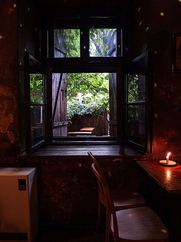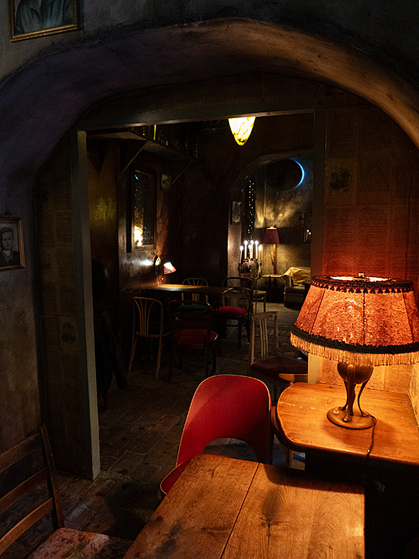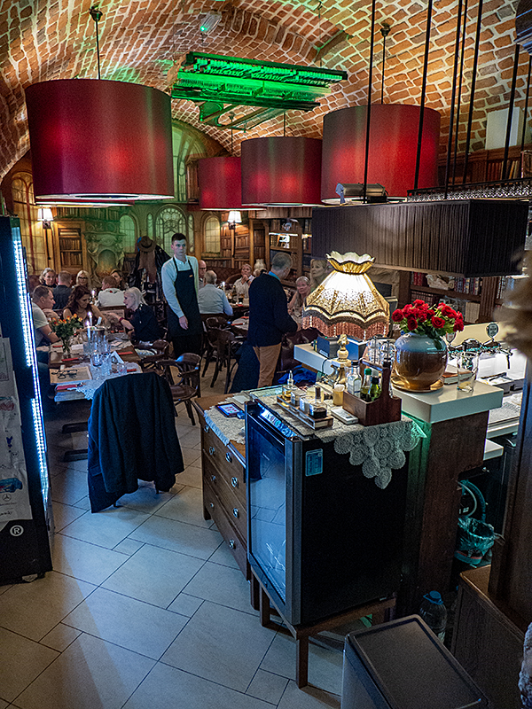 And then we turned north, crossed back over the river, and were in Kazimierz, the ancient Jewish quarter and modern hip funky area, just south of the Old Town. We hopped off the streetcar and met our friends at the restaurant just as they were paying the bill. Some of them headed off and would meet us later at an old-style basement restaurant near the Main Square, but one of them took us nearby to Eszeweria, a very boho coffee-and-beer place in a labyrinthine old building with candle lighting and tables that once held sewing machines. It’s the sort of place I would haunt if it were in Toronto. But it’s in Kraków.
