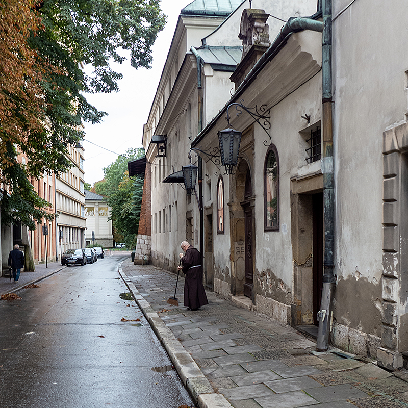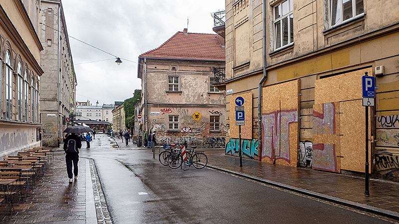 Anyway, it was a scenic detour. For a scant few złoty each, the streetcar gave us a scenic tour of the relatively modern and relatively not-so-modern parts of Podgórze, from boulevards with kebab joints past industrial parks and apartment blocks and into smaller older streets with smaller older buildings, at last passing the old graffiti-covered buildings along Limanowskiego in the heart of the former ghetto, where the Jews of Kraków had been forced by the Nazis to relocate, brooded over at its corner by the spires on spires on spires of the massive St. Joseph’s Church.