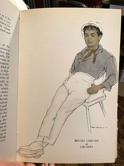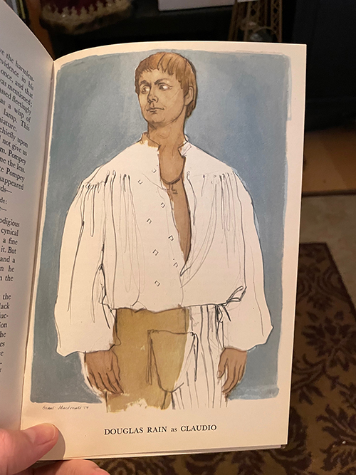 Robertson Davies, whose text takes up the larger part of the book, does not spend so much time on admonitions or theory, although he does have some thoughts on “psycho-analysis” as it relates to Oedipus Rex. In the main, he gives descriptions of the staging and comments on the performances of the cast in the season’s three plays: Oedipus Rex, Measure for Measure, and The Taming of the Shrew. And what a cast it is: many actors who came to be luminaries of Canadian theatre, illustrated with drawings by Grant Macdonald. You may or may not recognize all of these people, but if you’re a Canadian theatre buff you likely will.