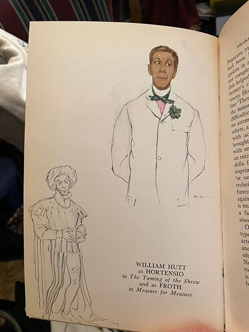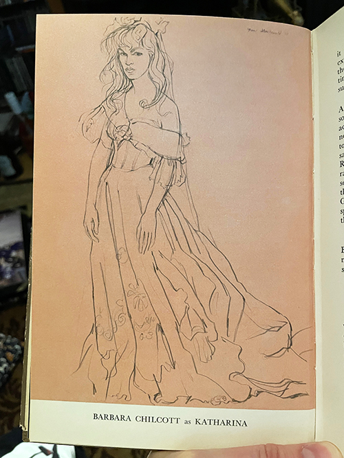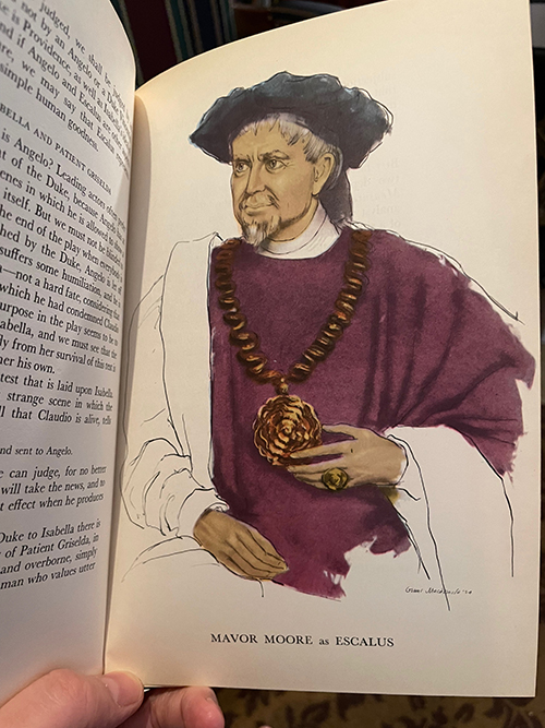 Robertson Davies, whose text takes up the larger part of the book, does not spend so much time on admonitions or theory, although he does have some thoughts on “psycho-analysis” as it relates to Oedipus Rex. In the main, he gives descriptions of the staging and comments on the performances of the cast in the season’s three plays: Oedipus Rex, Measure for Measure, and The Taming of the Shrew. And what a cast it is: many actors who came to be luminaries of Canadian theatre, illustrated with drawings by Grant Macdonald. You may or may not recognize all of these people, but if you’re a Canadian theatre buff you likely will.