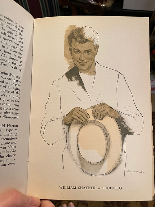 William Shatner, a 23-year-old from Montreal whose “self-assured and somewhat brassy delivery of his first speech” was “in itself a pleasant bit of comedy, and all through the play he gave a dimension of comedy to a character which can very easily be a romantic bore.” You may have heard of some of his later performances in American television shows and movies, wherein he gained some renown for, among other things, a certain… style of phrasing.