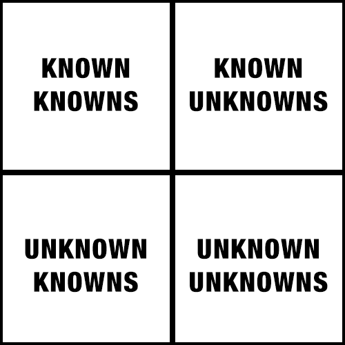 The existence of known knowns, known unknowns, and unknown unknowns implies the existence of unknown knowns. It’s right there. Yet people don’t seem to talk about them* – perhaps that’s why they’re unknown.