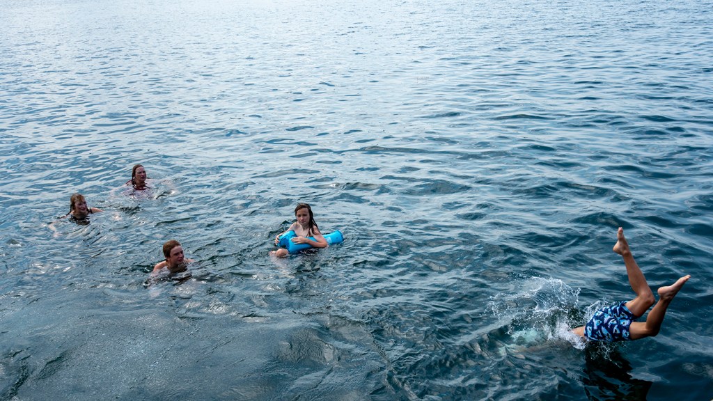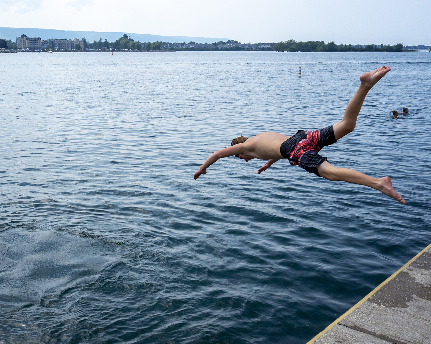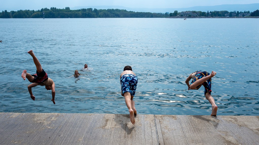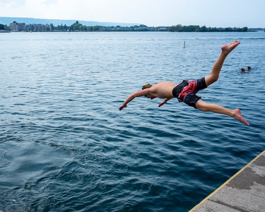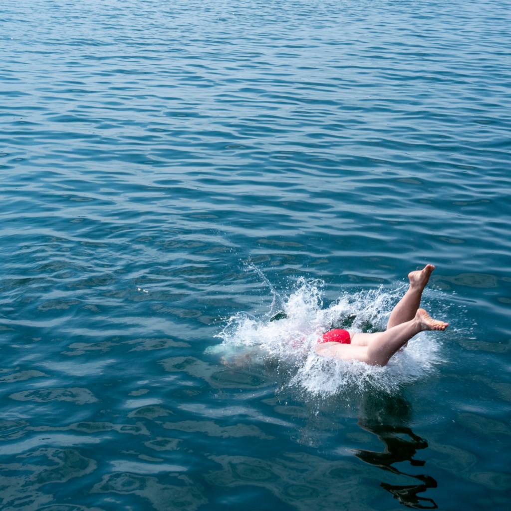 It’s hot, sticky, humid, sweaty. Time to dive, time to get wet, time to hurl yourself off a pier or quay or jetty or wharf or convenient boulder into a fresh cool lake. Lunge, take the plunge, splash: splunge.