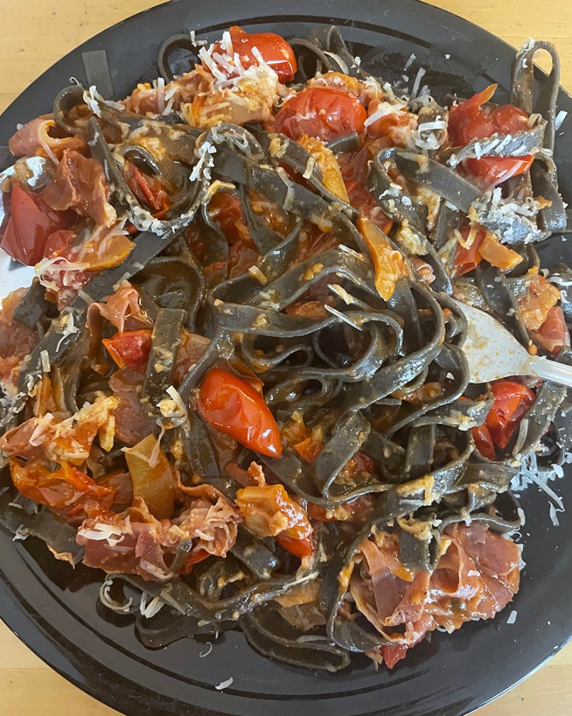 Well. I was just making supper tonight, and, as one may from time to time, I was using pasta with squid ink colouring. And on the front of the package, I noticed that, along with a photo of a tentacled sea creature on a bed of parsley, it said “tagliatelle con nero do seppia.”