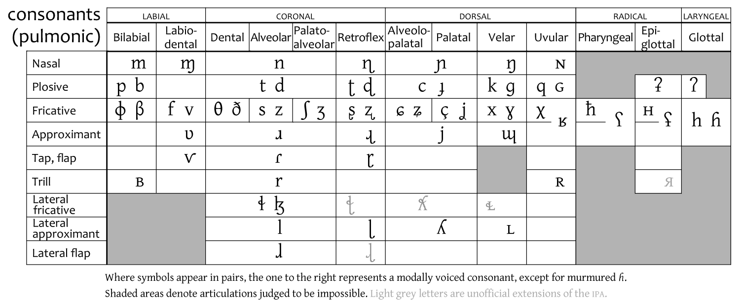 I won’t explain all the terminology because we don’t have all night. But you’ll see that this chart has grey areas: those are sounds that are considered impossible. A pharyngeal lateral fricative, for instance, would require having your something like the tip of your tongue stuck back deep in your throat – which, even if it were physically possible, would stimulate your gag reflex. So the grey areas help us confirm aspects of reality. They also force us to clearly define what we mean by our terms. For instance, “lateral” it means going around the side(s) of the tongue, like the sound [l]; a labiodental lateral fricative is impossible because it would require going around the sides of your tongue without using your tongue, because “labiodental” means using a lip and the teeth (and not the tongue). If “lateral” could mean the side of something other than the tongue, such as air going out the sides of the mouth while biting your lip, the labiodental lateral fricative box would not be grey.
